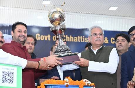 चक दे इंडिया के नारे के साथ मुख्यमंत्री भूपेश बघेल ने उठाई हाकी विश्वकप की ट्राफी, भारत को विश्व विजेता बनने के लिए दी शुभकामनाएँ