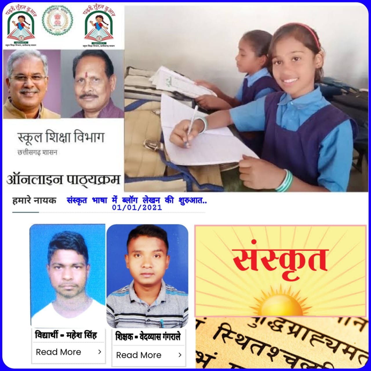 हमारे नायक के ब्लॉग लेखक की टीम अपनी सफलता की चरम सीमा पर कार्य करते हुए आज इस नव वर्ष 2021 के प्रथम दिवस को हमारे नायक में संस्कृत भाषा में ब्लॉक लेखन का कार्य प्रारंभ हो गया है । इसके अंतर्गत पढ़ई तुंहर दुआर की वेबसाइट हमारे नायक कॉलम में 1 जनवरी 2021 को संस्कृत भाषा का प्रथम ब्लॉग शिक्षक संवर्ग का बस्तर संभाग के दंतेवाड़ा जिले के सक्रिय शिक्षक वेदव्यास गंगराले और विद्यार्थी संवर्ग में प्रथम ब्लॉग सरगुजा संभाग के सरगुजा जिले के विशेष आवश्यकता वाले प्रतिभाशाली छात्र महेश सिंह का हिन्दी अनुवाद के साथ उपलब्ध रहेगा। शिक्षक का ब्लॉग, ब्लॉग लेखक श्रीमती डॉ.तरूणा सिंह जबकि विद्यार्थी का ब्लॉग श्रीमती दीपलता देशमुख के द्वारा लिखा गया है।