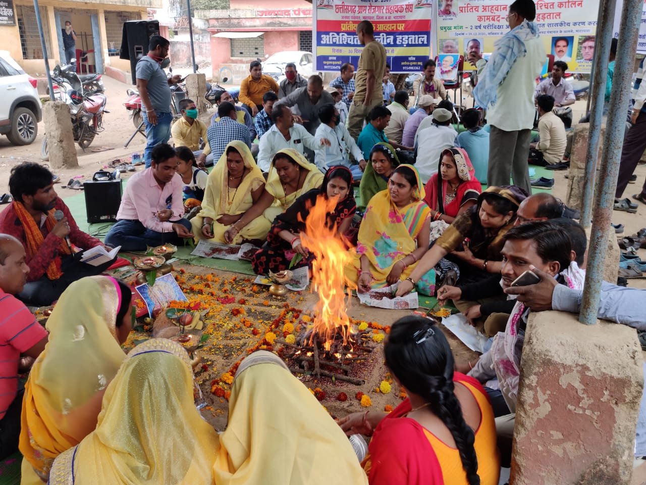 रोजगार सहायक संघ ने प्रदेश सरकार को सद्बुद्धि देने धरना स्थल पर किया यज्ञ हवन