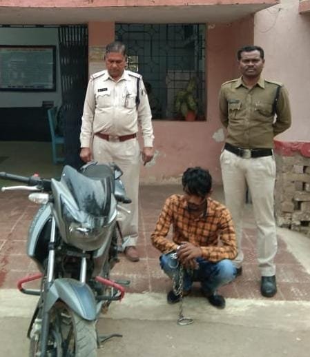 थाना प्रभारी राम अवतार ध्रुव के नेतृत्व में प्रकरण के अज्ञात आरोपी मोटर साइकिल चोर की पता तलाश लगातार किया जा रहा था कि दिनांक 07/01/ 2021 को मुखबिर से सूचना मिली कि आशीष पिता विनोद मसीहा मार्ग 19 वर्ष निवासी ईदगाह चौक बिलासपुर के द्वारा एक अपाचे मोटर साइकिल को लेकर भाटापारा शहर सदर बाजार में घूम रहा है सूचना नुसार घेरा बंदी कर पकड़े पूछताछ करने पर अपने मेमोरंडम कथन में सेमरिया घाट मेला दिन उक्त मोटर साइकिल को चोरी करना स्वीकार करने पर मोटर साइकिल को समक्ष गवाह के विधिवत जप्त कर कब्जा पुलिस लिया गया आरोपी को विधिवत गिरफ्तार माननीय न्यायालय रिमांड पेश कर जेल दाखिल किया गया।उक्त कार्यवाही में थाना प्रभारी राम अवतार ध्रुव स उ नि विष्णु नारायण सिंह एवम् थाना भाटापारा ग्रामीण पुलिस का विशेष योगदान रहा.