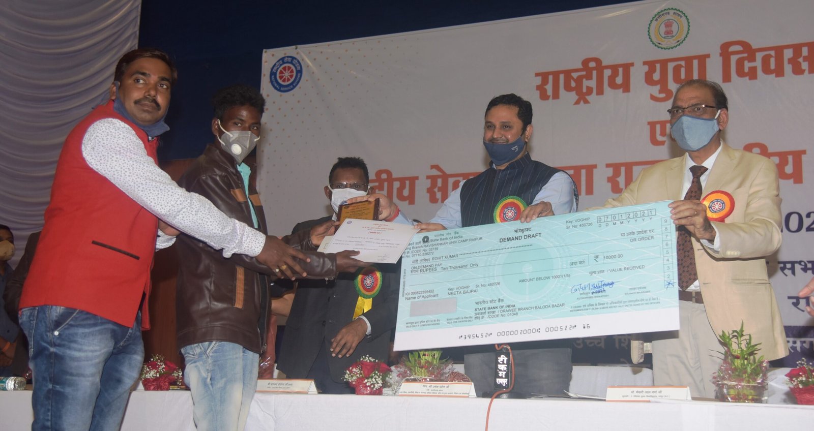 महाविद्यालय स्तर पर स्वयं सेवकों में श्री शंकराचार्य कॉलेज जुनवानी, भिलाई की कुमार तनुजा वर्मा, शासकीय रानी सूर्यमुखी देवी महाविद्यालय छुरिया के नरेश कुमार साहू, शासकीय दानवीर तुलाराम महाविद्यालय उतई के परमेश्वर कुमार ठाकुर, शासकीय महाविद्यालय कांकेर की कुमारी शिल्पा साहू, शासकीय विज्ञान महाविद्यालय बिलासपुर के अक्षत तिवारी और कमला नेहरू महाविद्यालय कोरबा के अटल श्रीवास्तव को पुरस्कृत किया गया है। इसी प्रकार से शासकीय जे.यो.छत्तीसगढ़ महाविद्यालय रायपुर के निखिल कुमार यादव, समाजशास्त्र अध्ययन शाला कला भवन पंडित रविशंकर शुक्ल विश्वविद्यालय रायपुर के टकेश्वर साहू, शासकीय बाबू छोटे लाल श्रीवास्तव स्नातकोत्तर महाविद्यालय धमतरी के तुषार पाण्डेय, श्री सांई बाबा आदर्श महाविद्यालय डिगमा अम्बिकापुर की कुमारी राधिका, शासकीय रामनुज सिंह देव स्नातकोत्तर महाविद्यालय बैकुन्ठपुर की कुमारी शालिनी सिंह श्याम, कृषि महाविद्यालय रायपुर के गागेन्द्र सिंह राजपुत, श्री शंकराचार्य ग्रुप आफ इन्टीट्यूशन भिलाई एस-1 के स्वाति घोटे और शंकराचार्य इंजीनियरिंग कॉलेज भिलाई एस-2 के राकेश कुमार को पुरस्कृत किया गया है। इसी प्रकार से विद्यालय स्तर पर स्वयं सेवको में शासकीय उच्च्तर माध्यमिक विद्यालय छछानपाहरी की कुमारी छवि साहू, शासकीय उच्च्तर माध्यमिक विद्यालय घुघवा के निखिल, शासकीय उच्च्तर माध्यमिक विद्यालय सिसेदर के जय कुमार चक्रवर्ती, शासकीय उच्च्तर माध्यमिक विद्यालय अकलतरा के आशीष खण्डेल, शासकीय उच्च्तर माध्यमिक विद्यालय बारनवापारा के रोहित कुमार धु्रव और शासकीय उच्च्तर माध्यमिक विद्यालय कुनकुरी की कुमारी रिमा सिंह को पुरस्कृत किया। कार्यक्रम के प्रारंभ में मुख्य अतिथि एवं अन्य तिथियों ने स्वामी विवेकानंद के प्रतिमा पर माल्यार्पण किया और राजगीत और राष्ट्रीय सेवा योजना गीत का गायन किया गया। इस अवसर पर रविशंकर शुक्ल विश्वविद्यालय के कुलपति डॉ. केशरीलाल वर्मा, उच्च शिक्षा विभाग के सचिव श्री धनंजय देवांगन, उच्च शिक्षा आयुक्त श्रीमती शारदा वर्मा, राज्य कार्यक्रम अधिकारी एन.एस.एस. डॉ. समरेन्द्र सिंह सहित एन.एस.एस. के कार्यक्रम अधिकारी स्यवं सेवक सहित अन्य अधिकारी मौजूद थे।