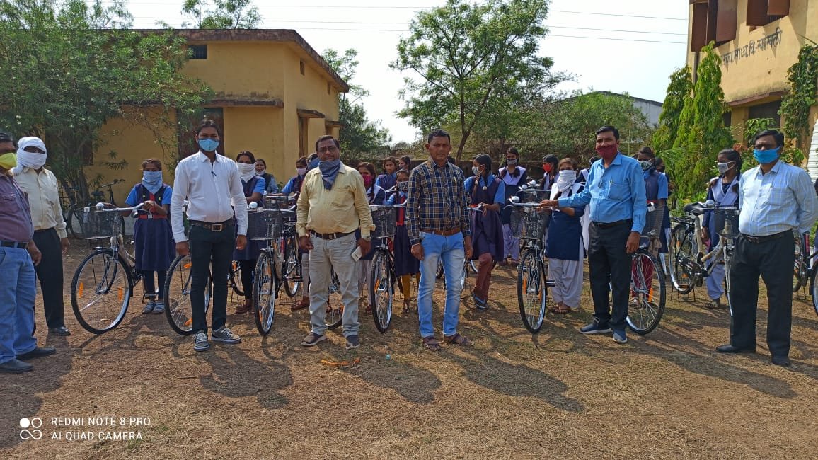 भाटापारा/ शासकीय उच्चतर माध्यमिक विद्यालय खोखली विकास खण्ड भाटापारा में सरकार की महत्वाकांक्षी योजना निः शुल्क सरस्वती सायकल योजना अंर्तगत विद्यालय के कक्षा नवमीं में अध्ययनरत 39 बालिकाओं को,कोविड-19 के नियमों का पालन करते हुए सायकल वितरण किया गया। जनपद सदस्य खोखली श्री रोशन साहू,सरपंच दुर्गा चतुर्वेदी,अध्यक्ष अजीत घृतलहरे सहित विद्यालय के प्राचार्य अनुज राम कुर्रे,सायकल प्रभारी अरुण वर्मा ब्याख्याता चन्द्रप्रकाश ध्रुव,अशोक शर्मा,भूमेश पाण्डे, गायत्री सोनवानी, राजेश्वरी वर्मा,जागृत्ति सोनवानी सहित समिति के सदस्य एवं स्टाफ के लोग इस अवसर पर उपस्थित रहे।