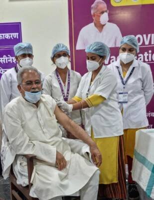 रायपुर/ मुख्यमंत्री भूपेश बघेल ने आज सवेरे रायपुर के पंडित जवाहर लाल नेहरू स्मृति चिकित्सा महाविद्यालय पहुंचकर कोविड-19 से बचाव के टीके की पहली खुराक ली। उन्होने टीका लगवाने के बाद डॉक्टरों से टीकाकरण के एक-दो दिनों के भीतर उत्पन्न होने वाली संभावित स्थितियों और टीकाकरण के तुरंत बाद रखी जाने वाली सावधानियों की जानकारी ली। उन्होंने स्वास्थ्य मंत्री टी.एस. सिंहदेव, स्वास्थ्य विभाग की अपर मुख्य सचिव श्रीमती रेणु जी. पिल्लै और कोरोना टीकाकरण की राज्य नोडल अधिकारी डॉ. प्रियंका शुक्ला से प्रदेश में टीकाकरण की ताजा स्थिति की भी जानकारी ली।मुख्यमंत्री श्री बघेल के साथ ही आज गृहमंत्री ताम्रध्वज साहू और उनकी धर्मपत्नी श्रीमती कमला साहू ने भी कोरोना से बचाव का टीका लगवाया। इस मौके पर छत्तीसगढ़ गृह निर्माण मंडल के अध्यक्ष कुलदीप जुनेजा, महापौर एजाज ढेबर, चिकित्सा शिक्षा विभाग के संचालक डॉ. आर.के. सिंह, कलेक्टर डॉ. एस. भारतीदासन, वरिष्ठ पुलिस अधीक्षक अजय यादव, रायपुर मेडिकल कॉलेज के डीन डॉ. विष्णु दत्त, डॉ. भीमराव अम्बेडकर अस्पताल के अधीक्षक डॉ. विनीत जैन और मुख्य चिकित्सा एवं स्वास्थ्य अधिकारी डॉ. मीरा बघेल भी मौजूद थीं।