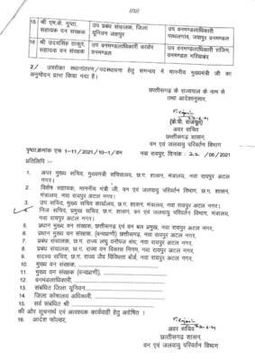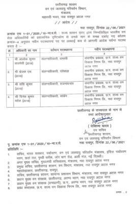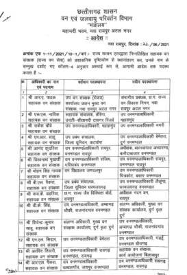 सहायक वन संरक्षक आरए पाठक को संभागीय प्रबंधक छत्तीसगढ़ राज्य वन विकास निगम, एएस नाविक को सहायक संचालक तौरेगा उदंती-सीतानदी से उप वनमंडलाधिकारी महासमुंद, राकेश चौबे को उप वनमंडलाधिकारी महासमुंद से उप वनमंडलाधिकारी नगरी, एमआर साहू को उप प्रबंध संचालक कटघोरा से उप वनमंडलाधिकारी बेमेतरा, आनंद कुदरिया को उप वनमंडलाधिकारी रायपुर से अधीक्षक बारनवापारा अभ्याराण्य, विश्वनाथ मुखर्जी को उप वनमंडलाधिकारी राजिम से उप वनमंडलाधिकारी रायपुर, मोहन सिंह नायक को उप वनमंडलाधिकारी लैलूंगा, डीके सिंह को मुख्य वन संरक्षक कार्यालय दुर्ग, शिवेंद्र कुमार साहू को उप वनमंडलाधिकारी अंबागढ़ चौकी, एनएल सिदार को उप वनमंडलाधिकारी गंडई, अरविंद तिवारी को सहायक वन संरक्षक बिलासपुर, आरएल पैकरा को उप वनमंडलाधिकारी रायगढ़, एमके गुप्ता को उप वनमंडलाधिकारी पत्थलगांव और उदय सिंह ठाकुर को उप वनमंडलाधिकारी कांकेर से उप वनमंडलाधिकारी राजिम बनाया गया है।