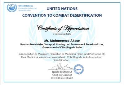 रायपुर। छत्तीसगढ़ में औषधीय पौधों के संरक्षण, संवर्धन एवं विकास की दिशा में हो रहे कार्यों की सराहना अंतर्राष्ट्रीय संस्था यूनाइटेड नेशन कन्वेंशन टू कंबैट डिजरटी फिकेशन संयुक्त राष्ट्र मरुस्थलीय करण रोकथाम कन्वेंशन (यूएनसीसीडी) द्वारा की गई है। उक्त संस्था यूएनसीसीडी द्वारा इसके तहत वन एवं जलवायु परिवर्तन मंत्री श्री मोहम्मद अकबर और छत्तीसगढ़ राज्य के पारंपरिक वैद्य संघ के प्रांतीय सचिव श्री निर्मल अवस्थी को सम्मानित किया गया है।