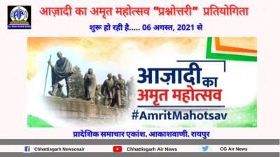 रायपुर। देश की स्वतंत्रता के पचहत्तर वर्ष पूरे होने के उपलक्ष्य में आजादी के अमृत महोत्सव के तहत प्रादेशिक समाचार एकांश, आकाशवाणी, रायपुर द्वारा छह अगस्त शुक्रवार से एक प्रश्नोत्तरी कार्यक्रम शुरू किया जा रहा है। इसके तहत छत्तीसगढ़ में स्वतंत्रता संग्राम के दौरान हुई घटनाओं, राज्य के स्वाधीनता सेनानियों और समाज सुधारकों से संबंधित प्रश्न पूछे जाएंगे। इन प्रश्नों को छत्तीसगढ़ी और हिन्दी प्रादेशिक समाचार बुलेटिनों में पूछा जाएगा। श्रोताओं को ई-मेल अथवा एसएमएस के जरिये जवाब देने होंगे। ये जवाब ई-मेल आईडी – ‘‘raipursawal@gmail.com’’ पर अथवा फोन नंबर – 94242-08182 पर एसएमएस के जरिये भेजे जा सकते हैं। जिस श्रोता का सबसे पहले सही जवाब प्राप्त होगा, उसे विजेता माना जाएगा और उसके नाम की घोषणा आगामी समाचार बुलेटिन में की जाएगी। साथ ही उसे प्रादेशिक समाचार एकांश की ओर से डिजिटल प्रमाण पत्र भी जारी किया जाएगा। इस प्रश्नोत्तरी कार्यक्रम के तहत हर शुक्रवार को प्रश्न पूछे जाएंगे।