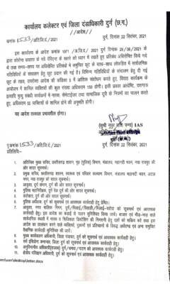 1071 /अ.जि.द/ 2021 दुर्ग दिनांक 29/06/2021 के द्वारा कोरोना वायरस के नये वेरिएन्ट के खतरे को ध्यान में रखते हुए प्रतिबंध अधिरोपित किये गये थे तथा समय-समय पर अधिरोपित प्रतिबंधों में समुचित छूट के साथ-साथ लोकहित में सार्वजनिक गतिविधियों के संचालन हेतु छूट प्रदान की गई है। विभिन्न गतिविधियों के संचालन हेतु दी गई छूट के तहत, उपरोक्त आदेश की कंडिका 5 में आंशिक संशोधन करते हुए, विवाह कार्यक्रम के आयोजन में शामिल व्यक्तियों की कुल संख्या अधिकतम 150 होगी। इसी प्रकार अंत्येष्टि, दशगात्र इत्यादि मृत्यु संबंधी कार्यक्रमों में मास्क, सेनेटाईजर तथा सामाजिक दूरी के नियमों का पालन करते
