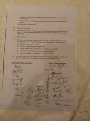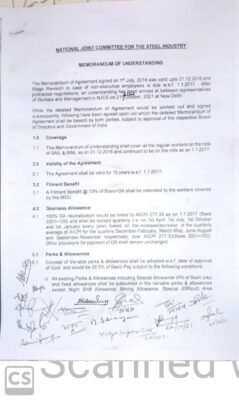 अधिकृत सूत्रों से मिली जानकारी के मुताबिक बीते 21 अक्टूबर को नई दिल्ली में में श्रमिकों संघो के प्रतिनिधि और प्रबंधन के बीच लंबी बातचीत के बाद समझौता हुआ है और दोनों पक्षों द्वारा एम ओ यू पर हस्ताक्षर कर दिया गया है। गौरतलब है कि इस्पात उद्योग के लिए राष्ट्रीय संयुक्त समिति समझौता 1 जुलाई 2014 को किया गया था, जो 31 दिसंबर 2016 तक वैध था।