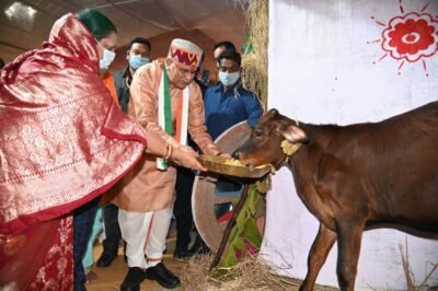 रायपुर/ मुख्यमंत्री श्री भूपेश बघेल के रायपुर स्थित निवास में हर वर्ष की तरह इस वर्ष भी गोवर्धन तिहार पारंपरिक हर्षाेल्लास के बीच धूमधाम और उत्साह के साथ मनाया जा रहा है । इस मौके पर मुख्यमंत्री श्री भूपेश बघेल ने धर्मपत्नी श्रीमती मुक्तेश्वरी बघेल और परिवार के सदस्यों के साथ तुलसी, गौरा-गौरी और गोवर्धन पूजा की और गौमाता को खिचड़ी खिलाकर प्रदेश की सुख-समृद्धि और खुशहाली की मंगलकामना की।