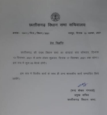रायपुर। छत्तीसगढ़ विधानसभा के शीतकालीन सत्र की अधिसूचना आज जारी कर दी गई है। बता दें कि 13 दिसंबर से 17 दिसंबर तक 5 दिनों का सत्र होगा।