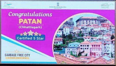 पाटन नगर पंचायत को कचरा मुक्त शहर में भारत का पहला 25000 से कम जनसंख्या वाले शहर में 5 स्टार रैंकिंग वाला शहर घोषित किया गया है। आज नई दिल्ली में आयोजित कार्यक्रम में यह सम्मान केंद्रीय आवास और शहरी कार्य मंत्री हरदीप सिंह पुरी ने मुख्यमंत्री भूपेश बघेल की उपस्थिति में पाटन नगर पंचायत केे अध्यक्ष भूपेंद्र कश्यप को प्रदान किया। पुरस्कार ग्रहण करने के बाद श्री कश्यप ने कहा कि पाटन ने लगातार स्वच्छता के क्षेत्र में उल्लेखनीय उपलब्धि हासिल की है। इसका श्रेय पाटन की जनता को जाता है, जिन्होंने शहर में स्वच्छता को लेकर एक नई संस्कृति का निर्माण कियाा है
