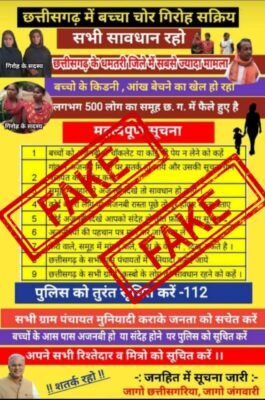 भिलाई । मुख्यमंत्री की फोटो लगाकर सोशल मीडिया पर बच्चा चोर गिरोह के पूरे छत्तीसगढ़ में सक्रिय होने पाम्पलेट पूरी तरह फेक है। ऐसे अफवाह वाली भ्रामक जानकारियां लोग बिना सत्यता जांच के सोशल प्लेटफार्म पर वायरल कर रहे हैं जो कि समाज में अंजान लोगों को आशंकित नजरों से देखते हुए लोग मारपीट कर रहे हैं।
