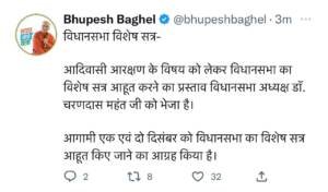 रायपुर/ मुख्यमंत्री श्री भूपेश बघेल ने आदिवासी आरक्षण के मुद्दे को लेकर विधानसभा का विशेष सत्र आहूत करने का प्रस्ताव विधानसभा अध्यक्ष डॉ. चरणदास महंत को भेजा है। मुख्यमंत्री ने आगामी एक एवं दो दिसंबर को विधानसभा का विशेष सत्र आहूत किए जाने का आग्रह किया है।