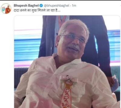 दरअसल, मुख्यमंत्री भूपेश बघेल ने अपने आधिकारिक सोशल मीडिया एकाउंट पर एक तस्वीर साझा की। इसमें उनके कुर्ते की जेब पर एक टैग लगा हुआ दिख रहा है। जिस पर – DADA To Be लिखा हुआ है। इसके साथ ही मुख्यमंत्री ने लिखा, दादा बनने का सुख मिलने जा रहा है। मुख्यमंत्री के इस पोस्ट पर लोगों की बधाइयां मिल रही हैं।