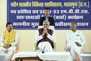 इस अवसर पर मुख्यमंत्री ने छात्र-छात्राओं को बधाई देते हुए कहा कि आप सब इस कॉलेज के पहले बैच का छात्र बन गए हैं। आपकी जिम्मेदारी समाज के लिए महत्वपूर्ण है। जब कोई भी जीवन और मृत्यु के बीच झूलता है तो डॉक्टर ही महत्वपूर्ण कड़ी के रूप में जीवनरक्षक के रूप में खड़ा रहता है। मुख्यमंत्री ने कहा कि हमारी सरकार शिक्षा और स्वास्थ्य के लिए लगातार कार्य कर रही है। उन्होंने कहा कि मेडिकल कॉलेज की स्थापना से अंचल में डॉक्टरों की संख्या बढ़ जाएगी। खुशी की बात है कि महासमुन्द में 125 सीटर नवीन मेडिकल कॉलेज की स्थापना की गई है। इस अवसर पर छात्र-छात्राओं ने उन्हें पेंसिल स्केच भेंट किया। संसदीय सचिव एवं स्थानीय विधायक श्री विनोद चंद्राकर ने महासमुंद में मेडिकल स्थापना के लिए मुख्यमंत्री श्री बघेल का आभार जताया। उन्होंने कहा कि मुख्यमंत्री के प्रयासों से ही यह सपना पूरा हो सका। इस अवसर पर गृह मंत्री श्री ताम्रध्वज साहू एवं नगर पालिका अध्यक्ष श्रीमती राशि महिलांगे एवं मेडिकल कॉलेज के स्टाफ एवं प्रशासनिक अधिकारी मौजूद थे।