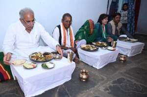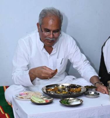 मुख्यमंत्री ने देवांगन परिवार के सदस्यों द्वारा सादगी के साथ परोसे गए स्वादिष्ट छत्तीसगढ़ी भोजन का स्वाद लिया। देवांगन परिवार ने पूरी आत्मीयता के साथ मुख्यमंत्री को भोजन में चावल, दाल, रोटी के साथ कुसुम भाजी, लाल और सेमी की मिक्स सब्जी, मुनगा, आलू-बड़ी की सब्जी, भांटा, गोभी मटर की सब्जी, जिमी कांदा पापड़, सलाद और विशेष रुप से चिरपोटी पताल की चटनी भी परोसा। गृह स्वामी झंगलू देवांगन और उनकी पत्नी श्रीमती बेसाखीन बाई मुख्यमंत्री जी के उनके घर आकर भोजन करने पर गदगद हो रहे थे। मुख्यमंत्री ने स्वादिष्ट छत्तीसगढ़ी भोजन के लिए श्री देवांगन एवं उनके परिजनों को उपहार भेंटकर धन्यवाद दिया ।