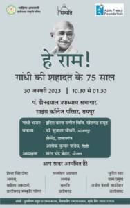 रायपुर। महात्मा गांधी की शहादत के 75वें साल पूरे होने पर देश भर में होने वाले कार्यक्रमों के सिलसिले में रायपुर में 30 जनवरी को छत्तीसगढ़ की तीन संस्थाएं मिलकर एक बड़ा कार्यक्रम कर रही हैं। साइंस कॉलेज परिसर स्थित डीडीयू सभागार में सुबह 10.30 बजे से चर्चा, संवाद, गांधी भजन और पोस्टर व चित्र प्रदर्शनी आयोजित किए जा रहे हैं।
