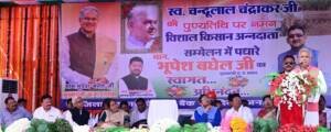 रायपुर। मुख्यमंत्री श्री भूपेश बघेल आज राजनांदगांव जिले के ग्राम भर्रेगांव में आयोजित विशाल किसान अन्नदाता सम्मेलन में शामिल हुए। वरिष्ठ राजनेता और प्रखर पत्रकार स्वर्गीय श्री चन्दूलाल चंद्राकर की पुण्यतिथि पर आयोजित सम्मेलन में मुख्यमंत्री ने जिलेवासियों को 24 करोड़ 31 लाख रूपए की लागत के विकास कार्यों की सौगात दी। उन्होंने कार्यक्रम में 43 हितग्राहियों को 11 लाख 94 हजार रूपए लागत की सामग्री वितरित की। मुख्यमंत्री श्री बघेल ने अपने उद्बोधन में स्वर्गीय श्री चन्दूलाल चंद्राकर को नमन करते हुए कहा कि उन्होंने छत्तीसगढ़ राज्य निर्माण में अविस्मरणीय योगदान दिया है। मुख्यमंत्री ने उनके जीवन से जुड़ी बातें साझा की और बताया कि पत्रकारिता के क्षेत्र में उनका महत्वपूर्ण अवदान रहा है। धन-धान्य से परिपूर्ण छत्तीसगढ़ समृद्ध रहे, उनका यह सपना था। आज यह सपना साकार हो रहा है।