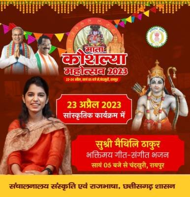 रायपुर/ माता कौशल्या महोत्सव का आगाज शनिवार को हो चुका है। महोत्सव के दूसरे दिन चंदखुरी स्थित माता कौशल्या धाम में देश की मशहूर क्लासिकल सिंगर मैथिली ठाकुर अपने भक्तिमय गीत-संगीत और भजनों की प्रस्तुति देंगी। मूलतः बिहार की रहने वाली मैथिली ठाकुर ने देश के युवा वर्ग में अपने गीत-संगीत से एक अलग पहचान बनायी है और पूरा देश उनके गीत-संगीत का कायल है।