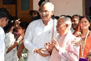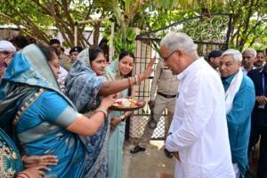 रायपुर/ मुख्यमंत्री श्री भूपेश बघेल अपने प्रदेशव्यापी भेंट-मुलाकात अभियान के तहत आज रायपुर ग्रामीण विधानसभा अंतर्गत कामरेड सुधीर मुखर्जी वार्ड क्रमांक 54 स्थित श्री मोहन साहू के घर पहुंचे। मुख्यमंत्री अपने भेंट-मुलाकात कार्यक्रम के बाद श्री साहू के आतिथ्य में भोजन के लिए पहुंचे। मुख्यमंत्री का साहू के परिवारजनों ने घर के मुख्य द्वार पर तिलक-आरती किया और पुष्प-गुच्छ तथा गमछा भेंटकर आत्मीय स्वागत किया। इस अवसर पर मुख्यमंत्री के साथ रायपुर ग्रामीण विधायक श्री सत्यनारायण शर्मा, नगर निगम महापौर श्री एज़ाज़ ढेबर, जिला केंद्रीय सहकारी बैंक के अध्यक्ष श्री पंकज शर्मा एवं अन्य उपस्थित थे।