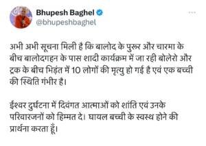 मुख्यमंत्री भूपेश बघेल ने देर रात ट्वीट कर दुर्घटना पर शोक जताया है। उन्होंने लिखा है कि- अभी अभी सूचना मिली है कि बालोद के पुरूर और चारमा के बीच बालोदगहन के पास शादी कार्यक्रम में जा रही बोलेरो और ट्रक के बीच भिड़ंत में 10 लोगों की मृत्यु हो गई है एवं एक बच्ची की स्थिति गंभीर है। ईश्वर दुर्घटना में दिवंगत आत्माओं को शांति एवं उनके परिवारजनों को हिम्मत दे। घायल बच्ची के स्वस्थ होने की प्रार्थना करता हूं।