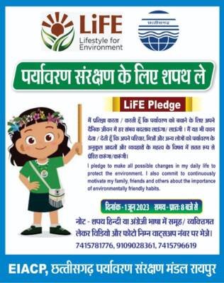 रायपुर/छत्तीसगढ़ में 01 जून को एक दिन में पांच लाख लोग पर्यावरण संरक्षण के लिए शपथ लेंगे। प्रदेश में मिशन लाईफ कार्यक्रम के अंतर्गत लाईफ स्टाईल फॉर इन्वायरमेंट कार्यक्रम का संचालन किया जा रहा है। इस कार्यक्रम के अंतर्गत छत्तीसगढ़ पर्यावरण संरक्षण मण्डल द्वारा विश्व पर्यावरण दिवस के अवसर पर आयोजित किए जा रहे कार्यक्रमों की श्रृंखला में 01 जून को पर्यावरण संरक्षण के लिये शपथ का कार्यक्रम रखा गया है। लाईफ प्लेज के अंतर्गत पूरे राज्य में एक साथ पांच लाख लोगों द्वारा प्लेज लिये जाने का निर्णय लिया गया है, जिससे कि व्यापक स्तर पर पर्यावरण संरक्षण के प्रति जन-जागरूकता लायी जा सके।