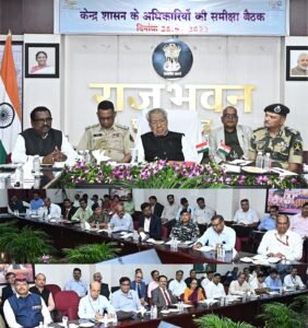 रायपुर/राज्यपाल श्री विश्वभूषण हरिचंदन ने आज राजभवन मे राजधानी रायपुर स्थित केंद्रीय शासन के विभाग प्रमुखों की बैठक ले कर उनके विभागीय गतिविधियों की जानकारी ली। राज्यपाल ने कहा कि केंद्र शासन द्वारा संचालित योजनाओं का लाभ आम लोगो पहुंचाना सुनिश्चित करें और योजनाओं का समुचित क्रियान्वयन किया जाये ताकि आम जनता को उसका पूरा लाभ मिल सके। उन्होंने कहा कि अधिकारियों को आम जनता के बीच जाकर केंद्र सरकार की योजनाओं की जानकारी देना चाहिए और योजनाओं से संबंधित उनकी समस्याओं को सुनकर समाधान करने के प्रयास करने चाहिए। उन्होंने कहा कि सरकार की कार्यपालिका का मुख्य अंग होने के नाते हम सभी का मुख्य उद्देश्य जनता की सेवा करना है इसलिए हम सभी को इसके प्रति निष्ठा, लगन एवं देश भक्ति भावना से मातृ भूमि के लिए कार्य करना चाहिए। बैठक में राज्यपाल के सचिव श्री अमृत खलखो, सीमा सुरक्षा बल के अतिरिक्त पुलिस महानिदेशक श्री अनुराग गर्ग सहित राजधानी रायपुर स्थित केंद्र सरकार के 38 विभाग प्रमुख उपस्थित थे।