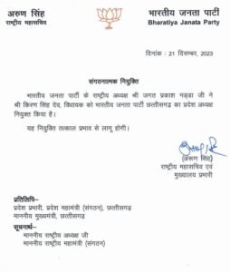 रायपुर। जगदलपुर के विधायक किरण सिंह देव भाजपा के नये प्रदेश अध्यक्ष होंगे। भारतीय जनता पार्टी के राष्ट्रीय अध्यक्ष जगत प्रकाश नड्डा ने किरण सिंह देव को भारतीय जनता पार्टी छत्तीसगढ़ का प्रदेश अध्यक्ष नियुक्त किया है। यह नियुक्ति तत्काल प्रभाव से लागू होगी। छत्तीसगढ़ में भारतीय जनता पार्टी ने बड़ा फेरबदल किया है। पार्टी ने अरूण साव के डिप्टी सीएम बनने के बाद जगदलपुर से विधायक किरण सिंह देव को छत्तीसगढ़ भाजपा की कमान सौंपी है। वहीं, कांग्रेस ने बस्तर के ही सांसद दीपक बैज को दोबारा अध्यक्ष बनाया है। कांग्रेस पार्टी दीपक बैज को बस्तर की बुलंद आवाज के रूप में प्रजेंट कर रही थी। ऐसा माना जा रहा है कि इसकी काट के तौर पर अब भारतीय जनता पार्टी ने यह कदम उठाया है। किरण सिंह देव जगदलपुर विधानसभा सीट से भाजपा के विधायक हैं। किरण सिंह देव रियासत कालीन जमींदार परिवार से ताल्लुकात रखते हैं। वे महापौर भी रह चुके हैं। पेशे से अधिवक्ता किरण सिंह देव ने भारतीय जनता युवा मोर्चा से अपनी राजनीति की शुरुआत की थी। वे भाजयुमो के जिला अध्यक्ष रहने के अलावा भाजाप के जिला अध्यक्ष, प्रदेश मंत्री और प्रदेश महामंत्री भी रह चुके हैं। विधानसभा चुनाव 2023 से पहले बिलासपुर संभाग के भाजपा के प्रभारी के तौर पर दायित्व संभाल रहे थे। किरण देव को संगठन में लंबा अनुभव है, जिसके कारण उन्होंने जगदलपुर की गुटबाजी खत्म करते हुए चुनाव जीता। उनके लंबे राजनीतिक अनुभव को देखते हुए राष्ट्रीय नेतृत्व ने उन्हें प्रदेश अध्यक्ष की जिम्मेदारी सौंपी गई है।