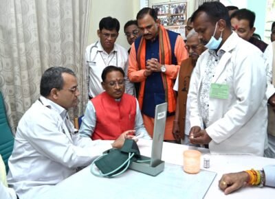 ’’स्वास्थ्य परीक्षण शिविर’’ के उद्घाटन अवसर पर मान. मुख्यमंत्री श्री विष्णु देव साय, मान. उपमुख्यमंत्री श्री अरूण साव, मान. लोक स्वास्थ्य और परिवार कल्याण चिकित्सा शिक्षा मंत्री, श्री श्याम बिहारी जायसवाल, मान. खाद्य, नागरिक आपूर्ति एवं उपभोक्ता संरक्षण मंत्री श्री दयाल दास बघेल का स्वास्थ्य परीक्षण चिकित्सा विशेषज्ञों द्वारा किया गया। उल्लेखनीय है कि स्वास्थ्य विभाग द्वारा प्रतिवर्ष विधान सभा परिसर में बजट सत्र के दौरान समस्त मान. सदस्यों के स्वास्थ्य परीक्षण के लिए शिविर का आयोजन किया जाता है । इस शिविर में ई.सी.जी., एक्सरे, सोनोग्राफी एवं पैथोलॉजी टेस्ट के साथ दन्त, ऑख, नाक, गला, ह्दय रोग संबंधी विभिन्न विशेषज्ञ/ चिकित्सक उपस्थित रहकर मान. विधायकों का स्वास्थ्य परीक्षण करेंगे ।