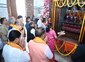 रायपुर/ राष्ट्रपति श्रीमती द्रौपदी मुर्मु छत्तीसगढ़ प्रवास के दूसरे दिन आज राजधानी रायपुर के गायत्री नगर स्थित महाप्रभु भगवान श्री जगन्नाथ मंदिर में पूजा-अर्चना कर देशवासियों के सुख-समृद्धि और निरंतर प्रगति के लिए आशीर्वाद मांगा। राष्ट्रपति श्रीमती मुर्मु इस दौरान जगन्नाथ सेवा समिति के सदस्यों से मिलकर उनका हाल-चाल जाना। उन्होंने इस मौके पर मंदिर पहुंचे प्रदेश के जनप्रतिनिधियों एवं वरिष्टजनों से भेंट की। इस अवसर पर राज्यपाल श्री रामेन डेका, मुख्यमंत्री श्री विष्णुदेव साय, केंद्रीय राज्यमंत्री श्री तोखन साहू, सांसद श्री बृजमोहन अग्रवाल, विधायक श्री पुरंदर मिश्रा सहित मंदिर समिति के पदाधिकारी उपस्थित थे।
