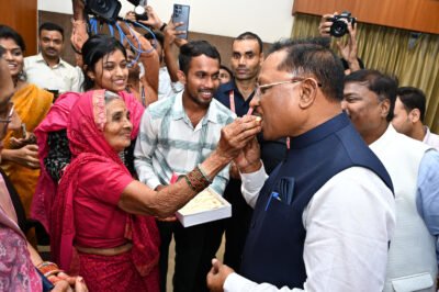 भिलाई से आई वयोवृद्ध श्रीमती दुलारबाई देवांगन के नाती और नाती बहु का चयन इस परीक्षा में होने की खुशी उनके चेहरे पर झलक रही थी। उन्होंने मुख्यमंत्री श्री विष्णु देव साय को अपने हाथों से मिठाई खिलाकर उनके प्रति आभार जताया। उन्होंने मुख्यमंत्री को बताया कि लंबे इंतजार के बाद उनके नाती श्री तिलक देवांगन और नाती बहु श्रीमती भारती देवांगन का चयन हुआ है। उन्होंने मुख्यमंत्री को हृदय से धन्यवाद दिया। चयनित अभ्यर्थियों के परिजनों और अभ्यर्थियों के चेहरे की खुशी देखते ही बन रही थी। मुख्यमंत्री श्री साय ने चयनित अभ्यार्थियों को बधाई और शुभकामनाएं देते हुए कहा इस वर्ष आप सबकी दीपावली अच्छी होगी। आप लोग अपने चयन की खुशियां मनाएं। दीपावली तथा राज्य स्थापना दिवस पर दीप जलाएं।
