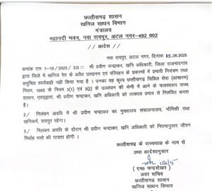 रायपुर/ खनिज रेत के अवैध उत्खनन एवं परिवहन पर प्रभावी नियंत्रण न करने और संबंधित प्रकरणों में समुचित कार्यवाही नहीं किए जाने के कारण खनिज साधन विभाग द्वारा जिला राजनांदगांव में पदस्थ खनि अधिकारी श्री प्रवीण चन्द्राकर को तत्काल प्रभाव से निलंबित कर दिया गया है। निलंबन अवधि में उनका मुख्यालय संचालनालय, भौमिकी तथा खनिकर्म, रायपुर नियत किया गया है।