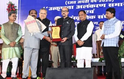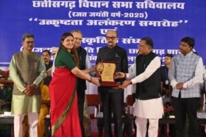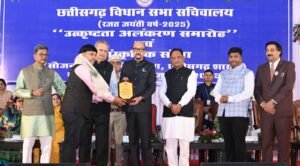 रायपुर। राज्यपाल श्री रमेन डेका के मुख्य आतिथ्य में आज छत्तीसगढ़ विधानसभा परिसर में आयोजित “उत्कृष्टता अलंकरण समारोह” गरिमामय वातावरण में संपन्न हुआ। विधानसभा अध्यक्ष डॉ. रमन सिंह ने समारोह की अध्यक्षता की। मुख्यमंत्री श्री विष्णु देव साय और नेता प्रतिपक्ष डॉ. चरणदास महंत विशिष्ट अतिथि के रूप में समारोह में शामिल हुए। “उत्कृष्टता अलंकरण समारोह” में वर्ष-2024 के लिए श्रीमती भावना वोहरा और श्री लखेश्वर बघेल को उत्कृष्ट विधायक के रूप में सम्मानित किया गया। उत्कृष्ट संसदीय रिपोर्टिंग के लिए दैनिक भास्कर के विशेष संवाददाता डॉ. राकेश कुमार पाण्डेय, सुदर्शन न्यूज़ चैनल के राज्य ब्यूरो प्रमुख श्री योगेश मिश्रा और सुदर्शन न्यूज़ के कैमरामेन श्री विश्वप्रकाश पुरेना को समारोह में सम्मानित किया गया।