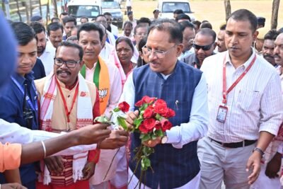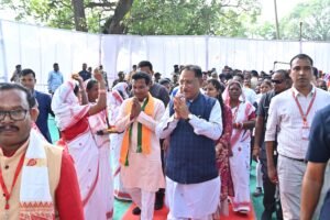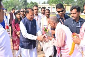 जशपुरनगर/ मुख्यमंत्री श्री विष्णुदेव साय माध्यमिक विद्यालय खेल मैदान हेलीपैड, ग्राम कण्डोरा पहुंचे। इस अवसर पर सांसद श्री राधेश्याम राठिया, कमिश्नर श्री नरेंद्र दुग्गा, आईजी श्री दीपक कुमार झा, श्री कलेक्टर श्री रोहित व्यास, पुलिस अधीक्षक श्री शशिमोहन सिंह, वनमण्डलाधिकारी श्री शशि कुमार सहित जनप्रतिनिधियो, अधिकारियों और रौतिया समाज के पदाधिकारियों ने उनका आत्मीय स्वागत किया। हेलीपैड पर पारंपरिक करमा नर्तक दलों ने उत्साहपूर्वक नृत्य प्रस्तुत कर मुख्यमंत्री का अभिनंदन किया और मनमोहक करमा नृत्य करते हुए उन्हें भव्य स्वागत के साथ कार्यक्रम स्थल तक लेकर गए।