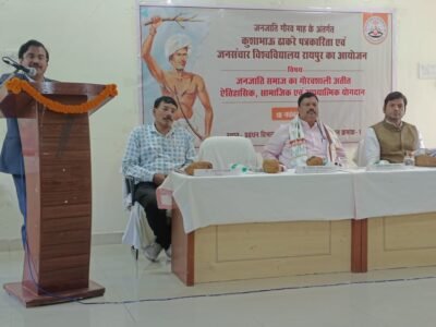रायपुर/ कुशाभाऊ ठाकरे पत्रकारिता एवं जनसंचार विश्वविद्यालय में भगवान बिरसा मुंडा की 150वीं जयंती के अवसर पर “जनजातीय समाज का गौरवशाली अतीत – ऐतिहासिक, सामाजिक एवं आध्यात्मिक योगदान” विषय पर विशेष कार्यक्रम का आयोजन किया गया। कार्यक्रम के मुख्य अतिथि छत्तीसगढ़ शासन के आदिवासी स्थानीय स्वास्थ्य परंपरा एवं औषधीय पादप बोर्ड के अध्यक्ष माननीय श्री विकास मरकाम थे। कार्यक्रम की अध्यक्षता विश्वविद्यालय के कुलपति एवं संभागायुक्त श्री महादेव कांवरे ने की।