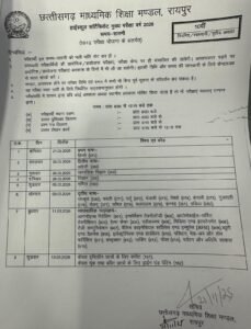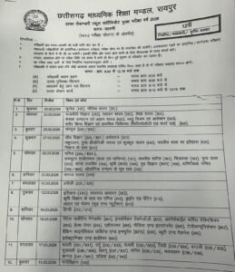 रायपुर। माध्यमिक शिक्षा मंडल ने कक्षा दसवीं एवं बारहवीं के मुख्य परीक्षा के लिए टाइम टेबल जारी कर दिया है। कक्षा बारहवीं की परीक्षा 20 फ़रवरी से 18 मार्च तक चलेगी। जबकि कक्षा दसवी की परीक्षा 21 फ़रवरी से शुरू होकर 13 मार्च को ख़त्म होगी। परीक्षाएं सुबह 9 बजे से बारह 12:15 आयोजित की जाएगी।