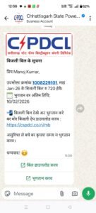 रायपुर। प्रदेश के बिजली उपभोक्ताओं को अब उनके व्हाट्स एप नंबर पर बिल भेजा जाएगा। वे इस बिल का पीडीएफ डाउनलोड करके सुरक्षित रख सकेंगे, उसका प्रिंट भी निकाल सकेंगे। इसमें उन्हें एक क्लिक करके बिल भुगतान की सुविधा भी मिलेगी। यह व्हाट्स एप मैसेज छत्तीसगढ़ स्टेट पॉवर डिस्ट्रीब्यूशन कंपनी लिमिटेड के आफिसियल वेरीफाइड आईडी से भेजी जाएगी, जिसमें अधिकृत ब्लूटिक लगी रहेगी।