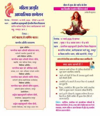 रायपुर। प्रजापिता ब्रह्माकुमारी ईश्वरीय विश्व विद्यालय के महिला प्रभाग द्वारा बलौदाबाजार मार्ग पर स्थित शान्ति सरोवर रिट्रीट सेन्टर में मंगलवार 10 मार्च को शाम 4.00 बजे महिला जागृति आध्यात्मिक सम्मेलन का आयोजन किया गया है। चर्चा का विषय होगा- वन्दे मातरम से स्वर्णिम भारत।