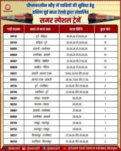 गाड़ी संख्या 08746 शालीमार-दुर्ग समर स्पेशल ट्रेन शालीमार से 23 एवं 30 अप्रैल, 2026 को परिचालन होगा ।