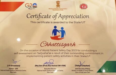 केन्द्रीय स्वास्थ्य मंत्रालय ने छत्तीसगढ़ को रोगी सुरक्षा गतिविधियों को उत्कृष्ट प्रतिबद्धता के साथ लागू करने और स्व-मूल्यांकन के लिए किया सम्मानित