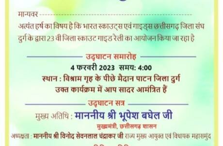 पाटन। भारत स्काउट्स एवम गाइड्स छत्तीसगढ़ जिला संघ दुर्ग द्वारा 4 फरवरी से 7 फरवरी तक 23वीं जिला स्काउट गाइड रैली का आयोजन पाटन...