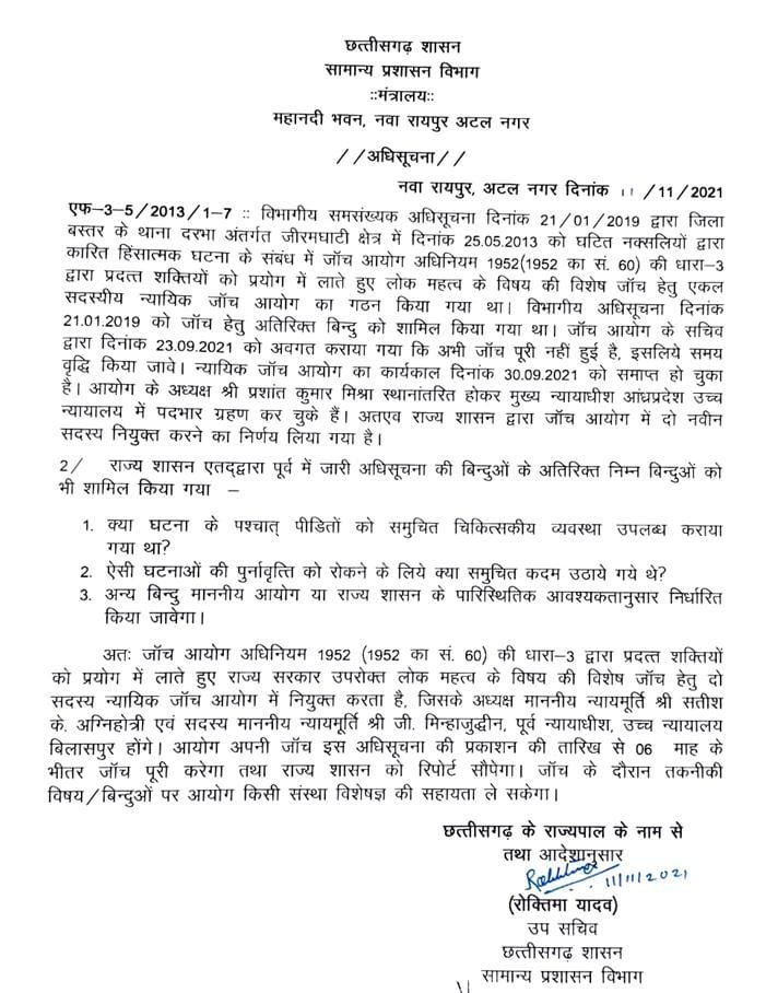 झीरम घाटी नक्सली हमले पर नया जांच आयोग गठित, न्यायमूर्ति सतीश के अग्निहोत्री अध्यक्ष और न्यायमूर्ति जी मिन्हाजुद्दीन सदस्य होंगे