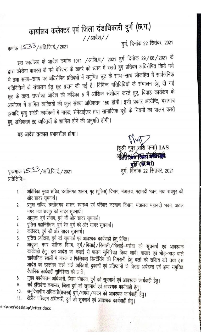 दुर्ग जिले में वैवाहिक एवं मांगलिक कार्यक्रमों में अधिकतम 150 व्यक्तियों के शामिल होने दी गई अनुमति, कलेक्टर ने जारी किया आदेश