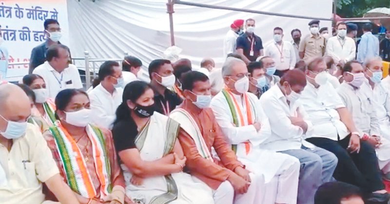 बारिश में भीगते मुख्यमंत्री बघेल और महिला सांसदों ने दिया मौन धरना, मंत्रिमंडल के सदस्य और कांग्रेस नेता भी हुए शामिल