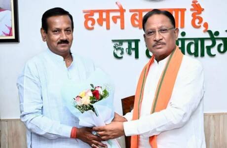 शपथ के बाद राज्यसभा सांसद देवेंद्र प्रताप सिंह मिले सीएम साय से