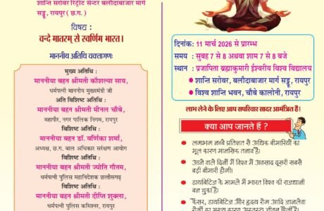 रायपुर। प्रजापिता ब्रह्माकुमारी ईश्वरीय विश्व विद्यालय के महिला प्रभाग द्वारा बलौदाबाजार मार्ग पर स्थित शान्ति सरोवर रिट्रीट सेन्टर में मंगलवार 10 मार्च को शाम 4.00...
